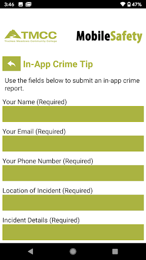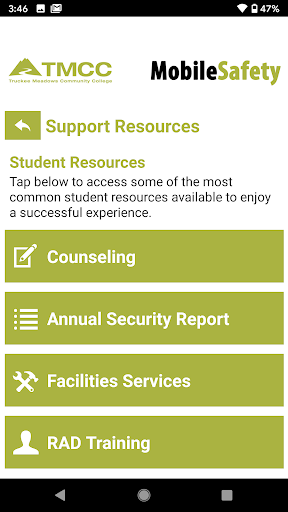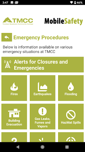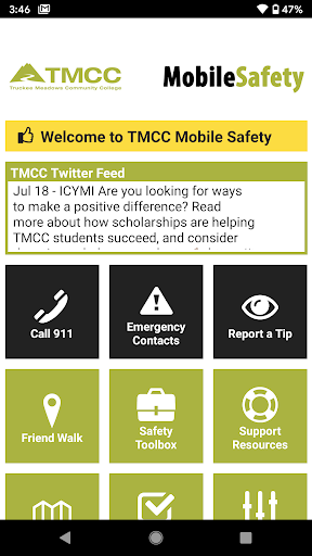 Mobile Safety is the official safety app of Truckee Meadows Community College (TMCC). It is the only app that integrates with TMCC's safety and security systems. TMCC has worked to develop a unique app that provides students, faculty and staff with added safety on the TMCC campus. The app will send you important safety alerts and provide instant access to campus safety resources.