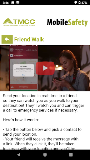 - Friend Walk: Send your location to a friend through email or SMS on your device. Once the friend accepts the Friend Walk request, the user picks their destination and their friend tracks their location in real time; they can keep an eye on them to make sure they make it safely to their destination.
