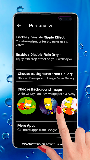 INTERACTIVE LIVE WALLPAPERS WITH REAL WATER RIPPLE EFFECT! It is something totally new in modern society, what makes smartphones look special. Many diffreremt themes of cute wallpapers will easily suit to kids, teens, adults and even seniors. Such app allows you to customize cool wallpapers of 4K resolution in the way you like it. Among benefits you will not have to worry about battery life and free space as this app is very friendly to smartphones.