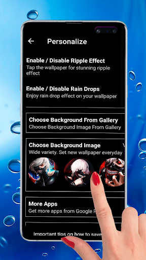 Here are cool set of live wallpapers with water ripple effect with kaneki ghole! 4K theme with tokyo ghole will make you look stylish!
