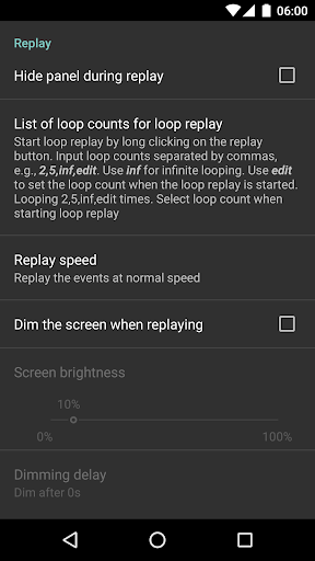 But beware, replaying touch events can fail or cause unwanted effects for many reasons, e.g., if replay is started at a different device state than during the recording or if during replay a popup is shown or something else is different than during recording. Thus, always monitor your device during replay! Replay automatically stops if you're touching the screen, pressing the power button or on a phone call.