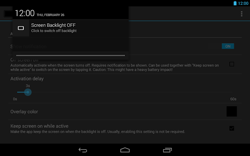 ● Shortcut (allows other apps, e.g., automation tools, to switch off the backlight via this app)