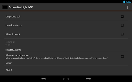 Most video players stop playback when the screen is turned off. This app switches only the screen backlight off but not the complete screen. Save battery and enjoy playback without the backlight staying on!