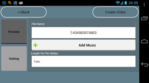 Simply: select images from custom Gallery, add a supported music, please use a good length music so It will be perfect then save and play the video.