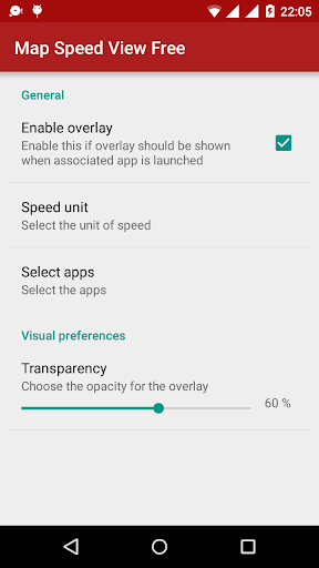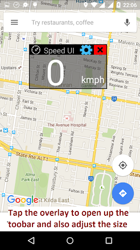 This app shows the current speed in google maps, other navigation apps or any apps installed in your smartphone. It automatically detects when your app of choice is launched and shows the overlay with a speedometer.