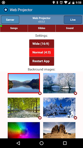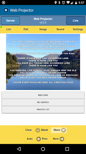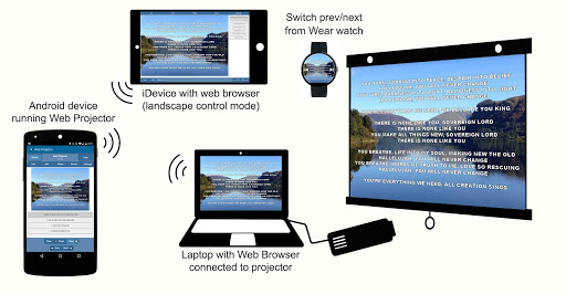 Web Projector is an all in one app for projecting songs or announcements from an Android device. By connecting to the local ip address of the device, you can display song or announcements via any web browser on a connected projector.