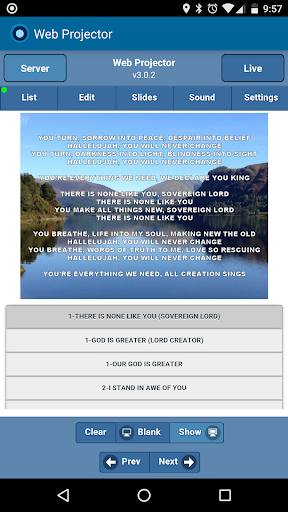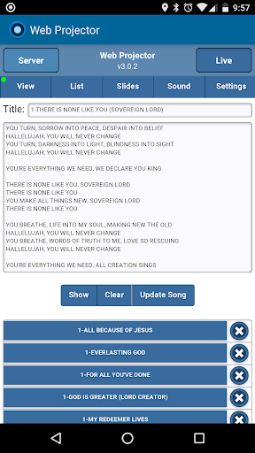Android tablet/phone on pulpit. Laptop on same network connected to a projector displaying a web browser connected to the Android tablet (ex. http://192.168.0.1:4444 for control or http://192.168.0.1:4444/#live for full screen display.) Iphone on same network with web browser connected to the Android tablet. Songs and announcements can be added, edited, deleted or changed on the fly from any of the 3 devices.