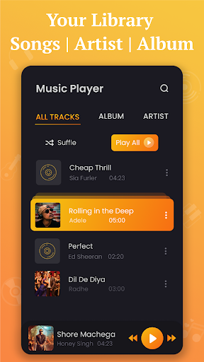 Smart search audio player supports almost all types of mp3, midi, wav, raw aac files and other audio formats. Easily browse and play music songs by genres, albums, artists, songs and folders.