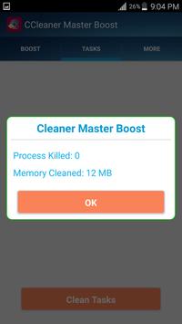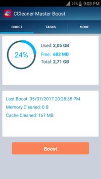 CCleaner master boostest un nettoyeur de périphérique Android petit et rapide, intelligent et un booster de performance, avec un nettoyeur d'ordures, un amplificateur de mémoire, un optimiseur de périphérique, un gestionnaire d'application. Avec cette application, vous pouvez libérer du stockage, stimuler la RAM, stimuler les jeux et faire fonctionner votre appareil comme nouveau. Le plus petit nettoyeur de téléphone, amplificateur de mémoire vive, amplificateur de jeu, nettoyeur de fichiers indésirables, nettoyeur de déchets, amplificateur de mémoire, optimiseur de batterie et gestionnaire d'applications pour vos téléphones Android ou tablettes. Meilleur nouveau garder votre téléphone plus rapide App!