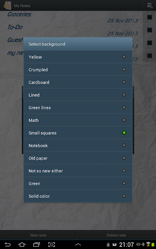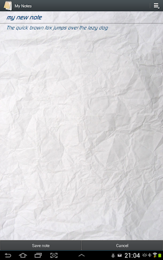 With My Notes you can easily create and save simple notes on your Android phone. All saved notes can be easily accessed and modified or deleted. All notes will be saved on the internal memory, so you won't lose any note if you remove your memory card.