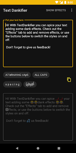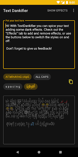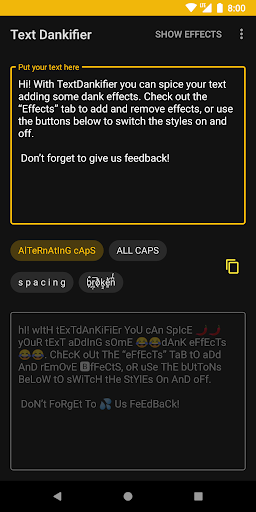 Make text fun! Text Dankifier lets you add various effects to text, like dank text and emoji replacements, aLtErNaTiNg CaPs, s p a c i n g