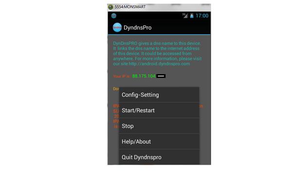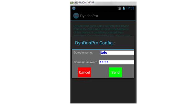 Dyndns Pro is a professionnal dyndns client on Android system. Is designed to set dynamic dns (dns dynamique , ip fixe) for devices running android as operating system. It links the domain name .dyndnspro.com to your actual android internet address (3G/4G/wifi...). Then, it sets the dns entry for your domainname.