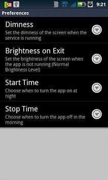 On first launch, hit the menu button and configure the settings to your liking. Hit "Apply Settings" when happy. If it is not within the time you set for the app to turn on, toggle the power to turn it off. Or, buy the Pro version which has a notification icon with the ability to toggle the dimmer on and off :P. Note: Turning on the screen sets the dimness according to the time of day, if "Ignore Power Toggle" is unchecked (OFF by default). If it is checked, dimmer only turns on manually.