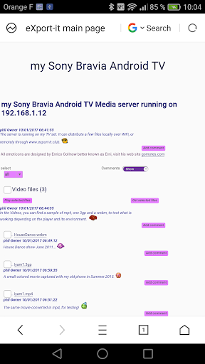 When using a Web browser as client you can write comments with emoticons everywhere in the page. Only the writer of a comment and the administrators can delete it. The files can be set in a categories to