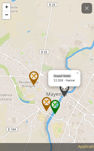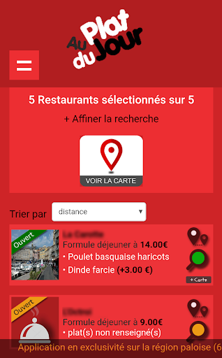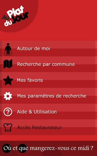 - Autour de moi (permet de lister les restaurants proposant un "Plat du Jour" et se trouvant dans la zone géolocalisée de votre smartphone et de les afficher dans une liste ou sur une carte)