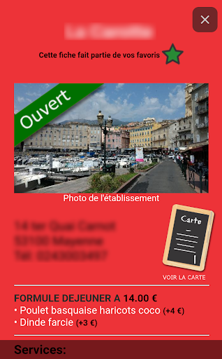 Mes favoris (permet de placer en favori le ou les restaurants de son choix et d'effectuer une lecture directe de leur fiche et de leurs propositions)