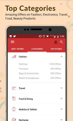 You have a one-click access to popular & top deals & offers. You can find these lists by Categories to view specific Electronics offers, Online food order offers, Mobiles offers, Grocery offers, flight offers, hotel booking deals, free recharge coupons, fashion discounts deals, computers & laptops deals etc.