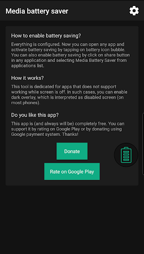 Screen usage is the biggest factor which drain your battery. This tool is dedicated for apps that does not support working while screen is off. With Media Battery Saver help, you can enable dark overlay, which disables your screen without interrupting other apps.