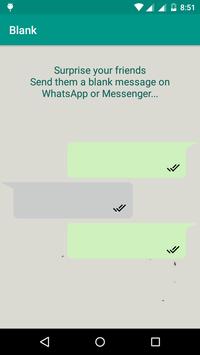 Surprise or irritate your friends, prank with them, send them a blank message on WhatsApp, Facebook messenger, and other social apps. Make your SMS/messages Viral and magical in your group. Show your magic trick to send a blank text. The blank messaging app is full of surprise, show the trick to anybody and enjoy the situations. Send a blanks message on WhatsApp, Facebook messenger and other to your friends. Your friend will see a blank space or a white space on his/her screen.