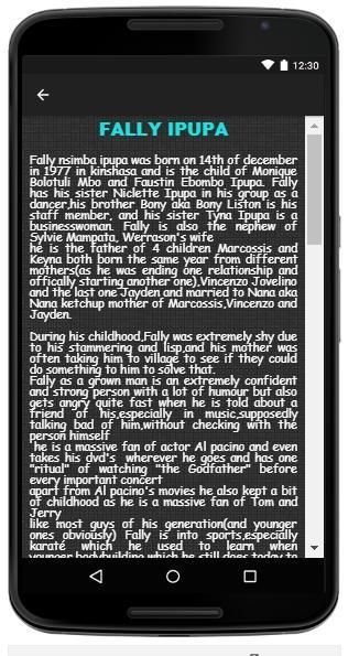 In this apps you can get info about Fally Ipupa biography, Tour Dates, with links to social media singer,Facebook, Twitter, Fan chat, add notes, play music with stream online and lyrics on songs Fally Ipupa
