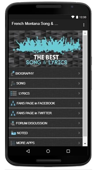 In this apps you can get info about French Montana biography, Tour Dates, with links to social media singer,Facebook, Twitter, Fan chat, add notes, play music with stream online and lyrics on songs French Montana