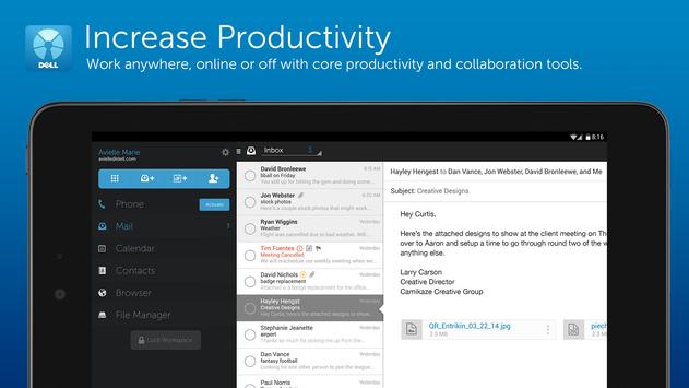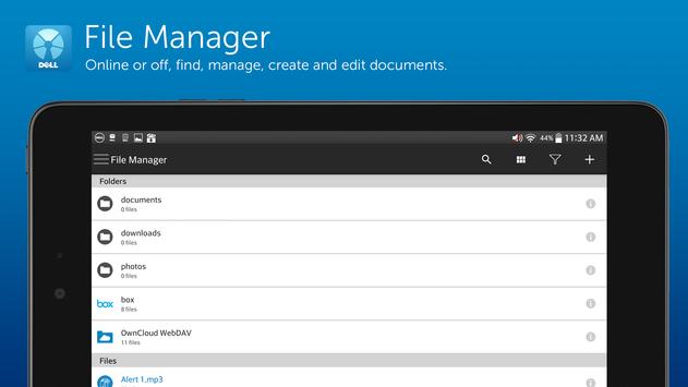 • Box for Dell - Share files and folders in the Box cloud, sync content between your devices and collaborate across your business. When used with Mobile Workspace, Box for Dell keeps corporate files and folders separate from your personal content while providing IT control and security for locally stored content.