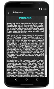 In this apps you can get info about Phoenix biography, Tour Dates, with links to social media singer, Facebook, Twitter, Fan chat, add notes, play music with stream online and lyrics on songs Phoenix