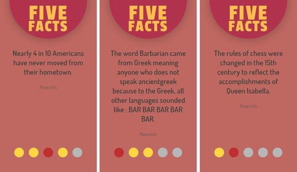 Five Facts is a free app that cover facts from "the constitution of the Bhutan specifies that 60% of the country must remain forested" to the fact "that the smallest thing ever photographed is the shadow of an atom".