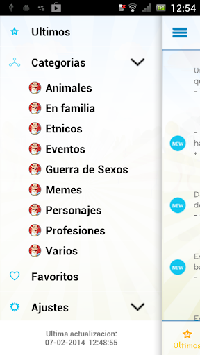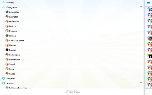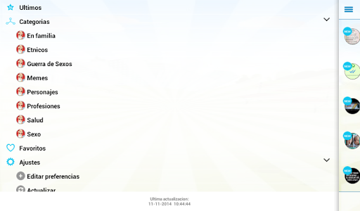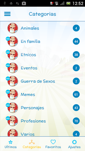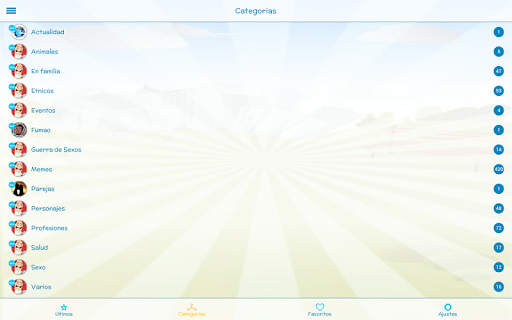 Cuando entres en la aplicación podrás decidir si quieres ver el material nuevo o si deseas navegar entre las diferentes categorías: actualidad, animales (gatos, parecidos), familia (amigos, hijos, lesbianas, novios, parejas, suegras, viejos), étnicos (Andaluces, Catalanes, Chinos, Esquimales, Leperos, Madrileños, Vacos), eventos, fumao, parejas (feministas, machistas), memes, personajes, profesiones (abogados, camareros, cine, curas y monjas, genios, informáticos, juicios, marineros, médicos, náufragos, policías, políticos, relaciones laborales, tiendas, toreros, ), salud (deportes, loocos)...