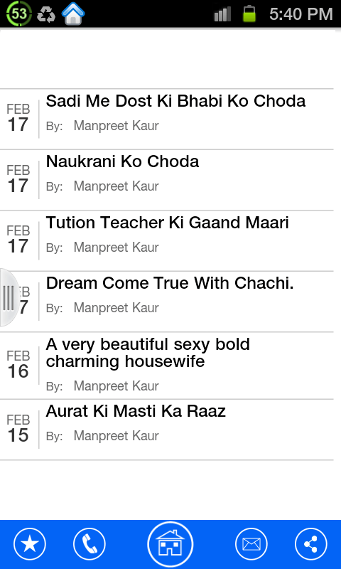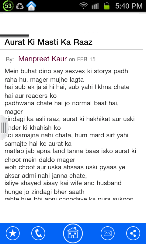 Enjoy the sexy and erotic Stories in different languages including English, Hindi and Urdu. Desi Stories: 1) Bhabhi Sexy 2) Biwi ki chudai 3) Blouse Cleavage 4) Aunty ke mumme 5) Sexy Education. 7) Lady Teacher 8) Mallu ka Blouse 9) Sexy After Marriage 10) Friends Mom 11) Seducing Reshma App contain stories based on real incident, different people narrated their stories. This is some of great collection of Desi Stories. Features: * Free App ( No Charges, No Contract, Lifetime Free) * Daily Update. * No signup or registration required. * Clean and Easy UI to read Stories. * Random Updates. * Latest Hindi Sexy Stories. * Stories Regularly Updated. Mail us your story that you would want to add in this app. If you have any story that you want to add in this app, you can mail us. In place of providing negative feedback, please mail us your suggestions to improve this application. ************************************************************************ Disclaimer: Desi Stories are submitted by user, if any one who is author of any story and want to remove story from this app, can mail us, we will remove that story. ************************************************************************ Note: This app is supported by Ads, all permission is required for showing ads in app. This App is Free. You would see some banner Ads. Only Airpush SDK integrated. Thank You for Understanding. Keywords: Sex stories, fuck stories, bed time stories, Bhabhi Sexy, Biwi ki chudai, Blouse Cleavage, Aunty ke mumme, Sexy Education, Lady Teacher, boobs and Blouse, Sex After Marriage, Friends Hot Mom, Seducing Reshma