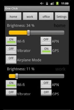 One Click is a simple settings manager app with a twist. One click can toggle wifi, Silent mode, Airplane mode, GPS, Mobile Data(APN) and change the screen brightness with JUST ONE CLICK!