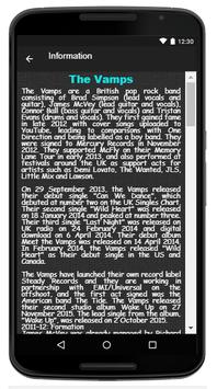 In this apps you can get info about The Vamps biography, Tour Dates, with links to social media singer,Facebook, Twitter, Fan chat, add notes, play music with stream online and lyrics on songs The Vamps