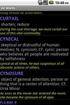 Application for learning words. Only the words that occur in word lists required by tests like GRE, GMAT, TOEFL etc. are present. Contains many useful features like automatically marking the difficult words and keeping their separate list. Has a test-like structure with five options for each word. Words can also be viewed randomly or as a complete word list.
