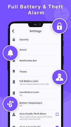 For charger removal and full battery alarm, users can select separate alarms for each so that he can distinguish between charger removal and 100% battery charged alert.
