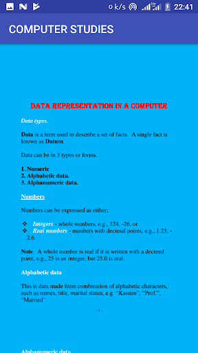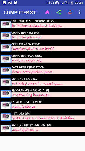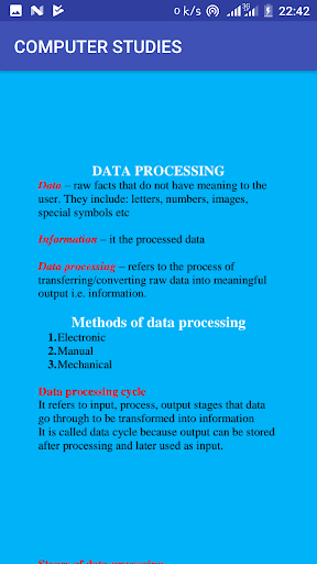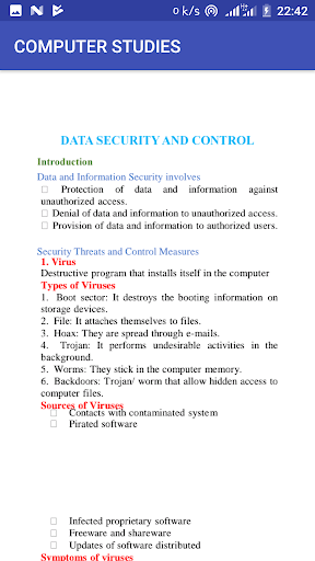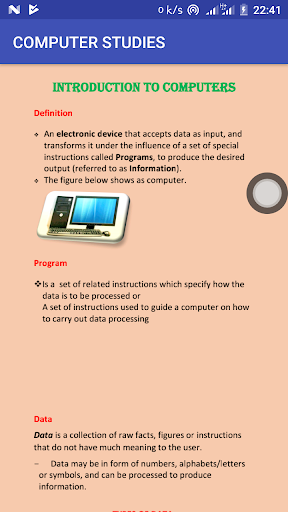 The application comprises of computer studies notes plus topical revision questions with answers.The topics covered include