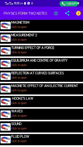 The app features the following topics magnetism measurement 2 turning effect of force equilibrium and center of gravity reflection at curved surfaces magnetic effort of an electric current hooke's law waves sound and fluid flow