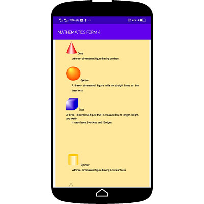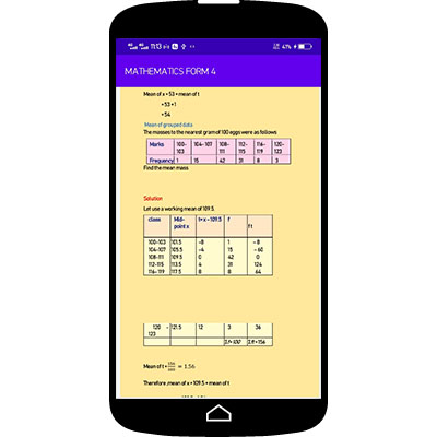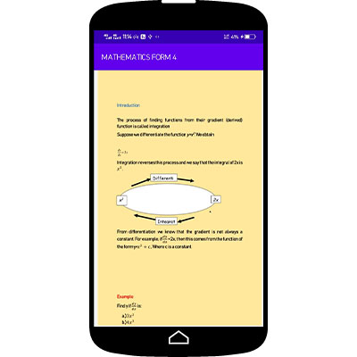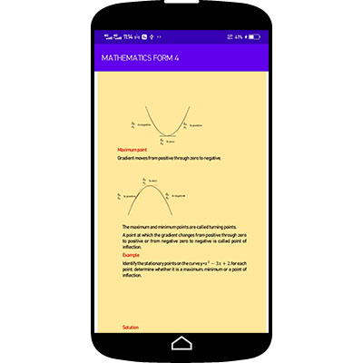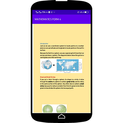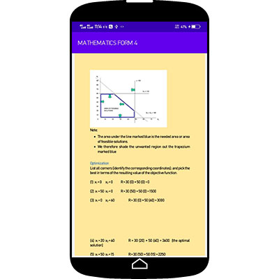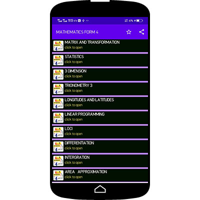 The app features the following topics -MATRIX AND TRANSFORMATION -LOCI -STATISTICS 2 -DIFFERENTIATION -LONGITUDES AND LATITUDES -INTERGRATION -LINEAR PROGRAMMING -TRIGONOMETRY -AREA APPROXIMATION