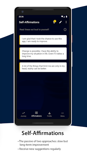 Security disclaimer: This application is only meant to support the user in their improvement, but they have to bring intrinsic motivation with them for this to work. It is not claimed that the app can do so through simple usage. The developer is not a professional doctor or psychiatrist; if you suffer from serious issues or depression, please visit a professional.
