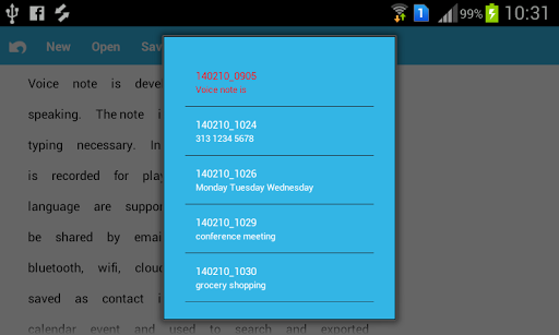 Dictation Note is developed to create note by speaking. The note is created and edited with no typing necessary. In addition, the voice is recorded for playback. Multiple languages are supported. The generated note can be: