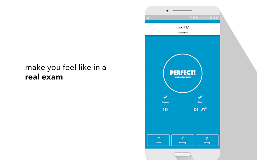 We try to design an app which for each test, you will have to give the answer to 10 questions in 3 minutes. The result only shows up after you finish the test. So, you will have to do it quickly and precisely. You will have the rushed feeling just like you are in a real-life exam.