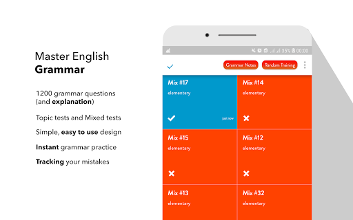 The app contains English grammar tests organized in many different topics or mixed-questions tests.