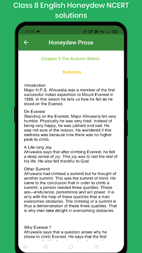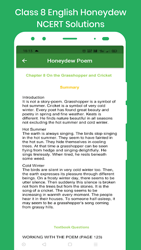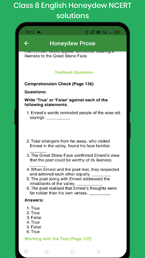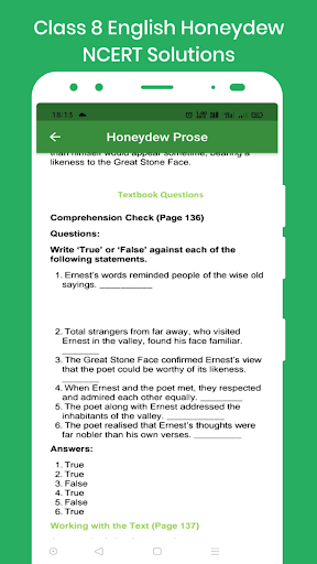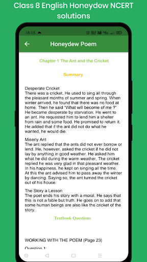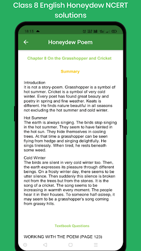 This application contains class 8 english honeydew NCERT Solutions Chapter wise with summary and question & answers. This application contains class 8 book solutions. I think this app is must have app for class 8 student.