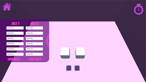 You can always change the game of dice by pressing the button enabled for it, in addition, in the games "Soft Dices", "Custom Dices" and "Places Dices" there is a button to choose a stopwatch !.