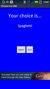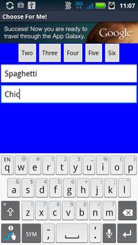Tired of being stuck in a restaurant, trying to decide what to order? Sick of trying to choose between dating John or Adam? Can't make up your mind about what kid you love the most? Let Choose For Me! decide for you!