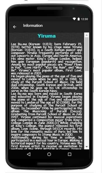 In this apps you can get info about Yiruma biography, Tour Dates, with links to social media singer,Facebook, Twitter, Fan chat, add notes, play music with stream online and lyrics on songs Yiruma