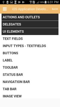 This application has various topics listed as under: getting started, environment setup related information, objective-c basics related information, first phone application related information, actions and outlets related information, delegates related information, ui elements related information, buttons related information, label related information, toolbar