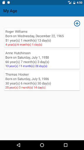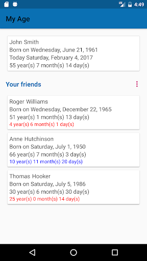 The easiest way to know how old you are in days, weeks, months and years. Save your friends and family ages, and get how old you are compared to them.