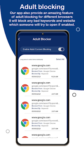 2) Adult Content Blocking : Enable web blocker, porn blocker or adult blocker by enabling this feature from dashboard your web browsers will filter those key words and websites which are inappropriate. Whenever someone try to search adult content it will be blocked and this search list will be saved in history section of adult content section.