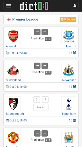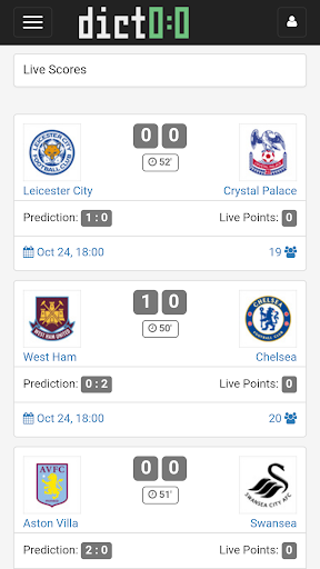 You can get points depending on your prediction. For example you get 5 points for prediction of exact score. 2 points for goals difference and 1 point for prediction of winner. There are many leagues where you can participate and win. Also you can follow live scores, players stats and much more in Dictoro.