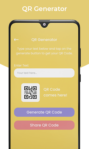 This Feature allows you to generate any type of qr code from the text you entered in the text field then click on generate button it will convert that to the bits form and show you the image of that then you can save or share it with anyone from the app.